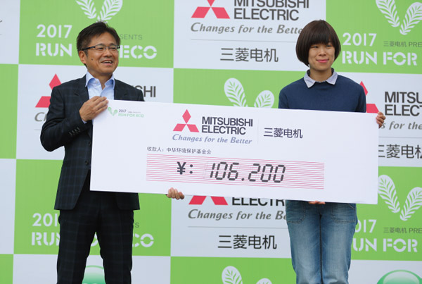加上此前开展的“RUN FOR ECO”线上活动所获得的价值50,000元的ECO POINT,与线下活动合并计算,最终捐献的总金额为106,200元。在闭幕式上,三菱电机中国总代表富泽先生向 中华环境保护基金会赠予本次活动善款,用于环保公益事业。