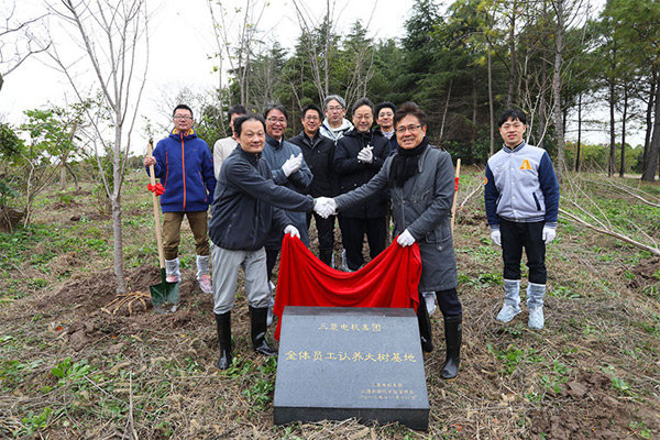 当天,约140名三菱电机集团员工、事业公司员工及其家属,热情高涨地来到海湾国家森林公园内的紫藤园,参与了植树活动。三菱电机株式会社执行董事中国总代表 • 三菱电机(中国)有限公司董事长兼总经理富泽克行先生和上海市普陀区环境保护局副局长蒋坚锋先生来到现场,共同主持了植树纪念碑的揭幕仪式并颁发了荣誉证书。在今年的植树活动中,共栽植了樱花树9棵,及紫藤树60棵。