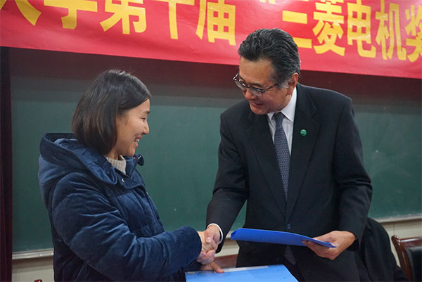 三菱电机机电(上海)有限公司总经理圡桥康先生出席了华中科技大学及合肥工业大学的颁奖典礼,为获奖学生进行了颁奖,同时向同学们介绍了三菱电机集团悠久的历史及广泛的业务领域。